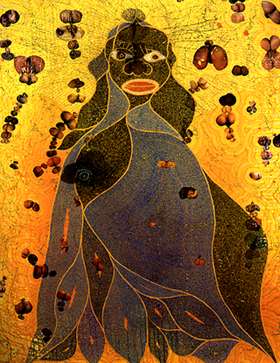 Even the shit is black. The legendary dung (African elephant, of course) is found not only on the canvas, usually decorated batik-style with colorful map pins, but also supporting the canvases. It's a joke, and an old and pointed joke at that -- most painters stand their canvases on paintpots while they work in just the same way, so what Ofili is telling us is that he paints shit. It's a no-brainer to recognize that that this isn't just London punk attitude but it's a message: This is still what it feels like to be black in the art world. To quote Cornel West (in Race Matters):